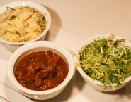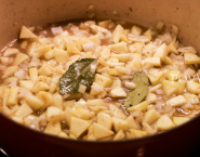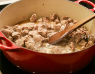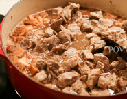 Voeg het vlees terug bij de saus. Schep de stamppot mooi op een bord, schik er de ragout bij en garneer het geheel af.
