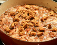 Als het vlees gaar is, passeer je de saus en bind je de saus met de schijfjes peperkoek.