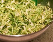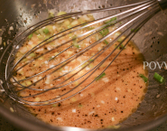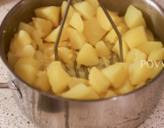 Marineer de gesneden en rauwe andijvie met de pezo, uitjes, olie, azijn, chilipeper en een lepel mosterd. Intussen de geschilde aardappelen garen in gezouten water. Giet ze af en laat ze even uitdampen. Stamp ze fijn met boter en een ei. Breng op smaak met pezonoot en roer de salade onder de puree.