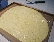 Klop de eiwitten met de basterdsuiker en meng het meringue onder het bovengenoemde mengsel. Giet in met papier ingelegde bakplaat, strijk het oppervlak glad met een spatel en bak bij 180°C gedurende 15 minuten.