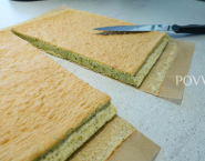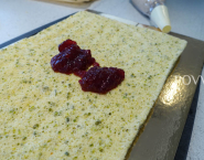Laat het deeg na het bakken afkoelen en snijd hem in helft terwijl het noch op het papier is. Verwijder het papier van de linke helft en smeer ze eerst met een dunne laag van bessengelei en daarna met de vulling.