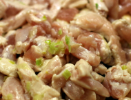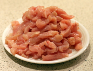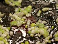 Snijd het vlees in reepjes. Versnipper de ui en bak ze op de olie tot glazig.