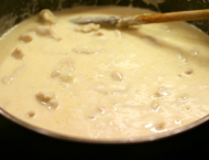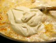 Als het vlees zacht is, voeg de melk bij (de hoeveelheid is afhankelijk van gewenste volume van de saus)en kook een beetje door. Los de bloem in de zure room en voeg bij het saus met vlees. Als het saus te dik lijkt, doe wat meer melk er bij.