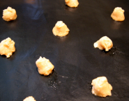 Meng de zachte boter met de suiker, het zout, de kaneel en de amandelschilfers. Spatel het water en de gezeefde bloem eronder. Spuit kleine toefjes op voldoende afstand van elkaar op een bakplaat belegd met een bakmatje met antiaanbaklaag.