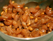 Meng alle ingrediënten voor marinade en zet opzij. Als je geen rode wijn hebt, gebruik rustig de witte en voor de saus gebruik in plaats rode een witte wijnazijn. Snijd het vlees in dunne korte reepjes en meng samen met marinade en pindanoten en laat 30 minuten rusten in de koelkast.