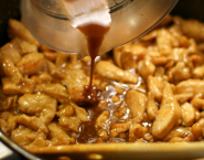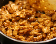 Verhit de olie in een pan en doe het gemarineerd vlees in. Bak hem van alle kanten. In een extra kom meng samen alle ingrediënten voor de saus en eens het vlees gaar is, voeg de saus erbij. Kook even samen tot de saus verdikt.