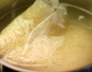 Kook intussen de rijst volgens aanwijzingen op de verpakking en gezouten water. Als ze gaar is, giet ze af en hou warm. Je mag in de rijst eventueel gesneden peterselieblaadjes toevoegen.