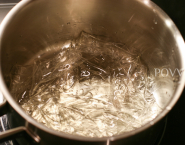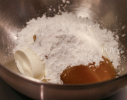 Preosej práš.cukor s múkou a mandľovým práškom. Vyšľahaj mixérom bielka do pevnej peny. Cukor pridávaj na trikrát. Miešacou lyžicou vyskúšaj, či sa z bielok tvorí špička. Ak áno, sneh je dostatočne pevný.