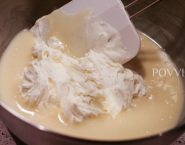 Primiešavaj postupne cukrovo-múčnu zmes špachtičkou do snehu. Nakoniec pridaj pistáciovú pastu a opatrne to celé premiešaj.