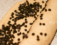 Kneed opnieuw, voeg de chocoladedruppels of brokjes toe en geef de gewenste vorm aan het deeg. Laat opnieuw rusten op een warme plaats voor een uur. Leg het deeg op een siliconen bakmat of in een bakvorm (ingevet en gebloemd).