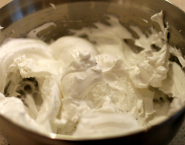 Verwarm de oven op 90°C. Klop de eiwitten op hoge snelheid met een handmixer of in de keukenmachine ongeveer 1 minuut. Het schuim moet glad en luchtig zijn. Klop verder tot je een mooie witte mousse krijgt, met mooie pieken. Voeg de suiker nu; lepel na lepel (klop nog zo’n 20-30 seconden voordat het toevoegen van een eetlepel suiker). Voeg zout en peper en ga door tot alle ingredienten ingewerkt zijn. Sneeuw moet 6-maal het oorspronkelijke volume hebben, moet stevig, glad en glanzend zijn.