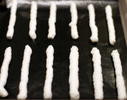 Vul de spuitzak met meringue. Spuit ongeveer 16 cm lange strepen op de bekleedde bakplaat. De ruimte tussen de stokken moet ongeveer 4 cm zijn.