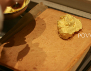 Splijt een vanillestokje en kook dit samen met het water en de suiker. Klop de eierdooiers los. Haal het vanillestokje uit de suikersiroop. Giet de hete suikersiroop op de eierdooiers en klop de massa koud, tot op lichaamstemperatuur. Voeg de boter toe bij dit mengsel en klop dit tot een mooie, gladde crème. Bestrijk één van de plakken met de boterroom. Leg de tweede plak erop en druk aan.