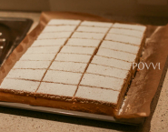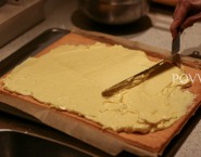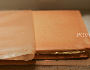Het beslag: Klop eerst de eiwitten en voeg de suiker toe. Klop dit tot een stevig schuim. Meng de bloem met de broyage. Spatel dit luchtig door de eiwitten. Verdeel het beslag gelijkmatig op een met bakpapier beklede bakplaat. Bak dit af in een oven van 180°, dit gedurende 30 minuten. Leg de plakken nadien meteen omgekeerd op een handdoek.