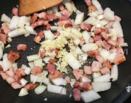 Bak het spek in een grote koekenpan op middelhoog vuur tot ze lichtbruin zijn. Voeg de ui en de geperste knoflook, zet het vuur laag en kook tot de groenten zacht zijn en lichtbruin, ongeveer 10 minuten.