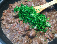 Haal de pan van het vuur en breng de levers met zout en veel peper. Roer de peterselie en, indien gebruikt, de koriander. Breng het mengsel in een keukenmachine en impuls 3-4 maal, enkel tot een ruwe pasta wordt verkregen.