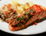Serveer de zalmfilets op voorverwarmde boorden met een beetje gestoomde aardappelen en een lepel rijst met gedroogd fruit. Doe de kapar-mayonaise op de aardappelen en versier de zalmstukjes met mengeling van kruiden met stukjes tomaat.