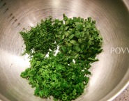 Snij de verse muntblaadjes in kleine vierkantjes en hak de dille en peterselie fijn. Doe alles in de kom. Deze kruiden dienen ons lichaam als antioxidanten helpen onze vertering.