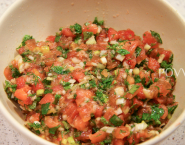 Snij de topjes van tomaten in kruisjes en giet erover gekookt water. Laat de tomaten 10 seconden (niet langer) in dit water en doe ze nadien onmiddellijk in het koud water. Schil dan de tomaten, verwijder het binnenste en snij het tomatenvlees in kleine vierkantjes. Doe ze in de kom met gesneden kruiden, voeg geperst knoflook en fijn gesneden ui toe. Voeg 2 el olijfolie, 2 el citroensap toe en breng op smaak met peper en zout. Zet de kom tot gebruik in de koelkast.