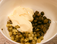 Meng in een andere kom de mayonaise met kapars en fijn gesneden zure augurken en zet tot gebruik in de koelkast. Voeg geen andere kruiden of ingrediënten meer toe. Alle ingrediënten in het recept zijn absoluut voldoende om samen een evenwicht in het menu te creëren. Daarom zijn geen andere kruiden of smaakverbeteraars overbodig.