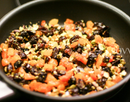 Verwarm de grillpan en doe de stukjes pruimen, abrikozen en fijn gehakte pistachenoten daarop. Besprenkel ze fijn met olijfolie en al roerend bak ze even tot ze lekker warm zijn. Als ze lekker warm zijn, meng ze onder gekookt rijst en hou alles warm. Gedroogd fruit helpt ons lichaam niet alleen om te verteren, maar ook bij de stoelgang.