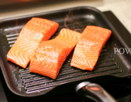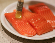 Bestrooi de zalmfilets met heel weinig zout, wrijf ze met de kwast met olijfolie. Geen andere smaakverbeteraars zijn niet van toepassing. Leg de stukjes zalm op de verhitte grillpan en gril ze enkele minuten van beide kanten. Klaar.