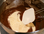 Meng de dooiers met de suiker en cacao. Klop de eiwitten tot een stevig schuim en voeg ze bij de eierdooiermengsel. Giet het deeg op met bakpapier of bakfolie bekleedde bakplaat, strijk hem glad en bak op 180°C tussen 10-15 minuten. Laat het deeg na het bakken afkoelen. Snij na het afkoelen van het deeg twee bodems met diameter 16-18 cm.