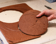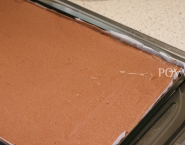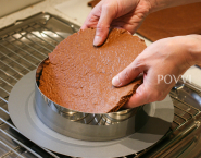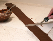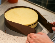 Bereid de chocoladelint als volgt: Ten eerste, snij de band van het bakpapier: de breedte zoals de hoogte en de lengte zoals het omtrek van de taart + 3 cm meer aan elke kant. Tempereer de chocolade en smeer hem met een kleine spatel langs de lengte in de dikte van 1,5 mm. Laat het even uitharden en dan boog rond de omtrek van de taart (zie foto hieronder). Uiteindelijk snijd de overtollige kanten af en zet in de koelkast voor enkele minuten tot de chocolade hard wordt. Verwijder nadien het papier uit de taartlint en versier de taart verder zoals hierboven beschreven.