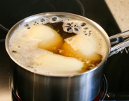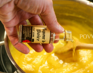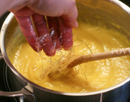 Pureer de peren samen met een flinke scheut van het sap uit het blik. Doe de suiker erbij en meng goed. Voeg het puddingpoeder toe en klop los. Klop de eidooiers eronder en verwarm hem op tot 85°C. Haal van het vuur en voeg de likeur en de gelatine toe. Klop de slagroom op en meng onder de crème.