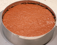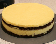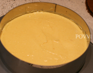 Doe de folie in flan ring en invoegen in het de eerste bodem. Giet de helft van de room op en steek meteen de tweede verdieping. Druk zacht alles naar beneden en giet de andere helft van de room. Plaats de taart in de koelkast minstens een uur, bij voorkeur gedurende 3 uur.