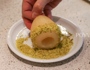 Bedek de bodem van gepocheerde peer gedoopt in geraspte pistachenoten.