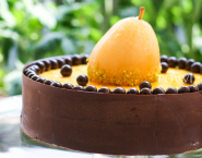 Zet de afgekoelde cake van de ring en versier de zijkanten met chocolade lint. Penseel op de top met gelei en chocolade parels en plaats bereid gepocheerde peer in het midden van de taart.