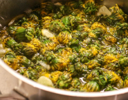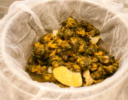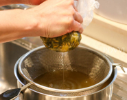 Wanneer het mengsel begint te koken, neem de pot van het vuur en laat alles een nacht staan. De volgende dag zeef het mengsel door een schone gaas of doek, druk de rest van het sap van de bloemen, voeg suiker en kook ongeveer 1 tot 1,5 uur tot de massa de structuur van honing krijgt. Eens klaar doe de honing in de schone weckpotten en laat afkoelen.