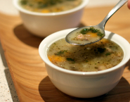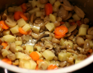 Verhit de olie in de pot en bak sjalot tot glazig. Voeg de aardappelblokjes, wortelen in ringen en uitgelekt champignons toe, bestrooi lichtjes met zout en bak alles even samen. Giet water en breng aan de kook. Als de soep begint te koken, voeg de groente bouillonblokje, geperste knoflook en laat sudderen tot de groenten zacht zijn. Wanneer de groenten zacht zijn, voeg 1 eetlepel bloem opgelost in 1 dl water en laat nog even sudderen. Breng op smaak met marjolein, gehakte peterselie, zout en peper en klaar.