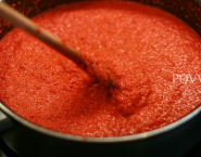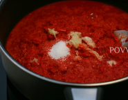 Papriku umyjeme a zbavíme jadier. Potom ju pomelieme na mäsovom mlynčeku- ak chceme pomazánku pikantnú, pridáme aj celé feferónky. Pridáme zvyšné prísady a povaríme spolu asi 30 minút. Dáme do menších pohárov a 10 minút sterilizujeme.