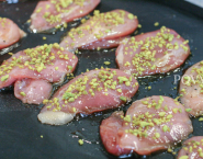 Marineer kwartel filets minstens 2 uur in een mengsel van olijfolie, sinaasappelsap, honing, sojasaus, peper en zout. Leg de filets op een licht ingevette bakplaat, bestrooi met gehakte pistachenoten en bak in de oven 10 tot 15 minuten. Hou ze warm.