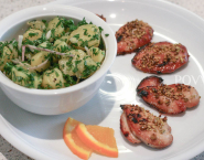 Ondertussen, bereid aardappel-kruidensalade volgens het recept van de link. Bestrooi de filets voor het serveren met gehakte pistachenoten (optioneel), dien op de voorverwarmde borden en serveer de salade in een aparte kom.