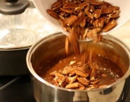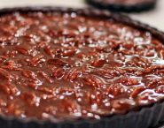 Reduce the temperature in the oven to 160°C (hot air oven 20°C). Melt the chocolate with the butter in a bain marie. Beat the eggs in a bowl with maple syrup and whiskey. Whisk this into the chocolate (still in bain marie) and keep stirring until the mixture binds. Stir in the pecans by the filling and pour it into the pie base.