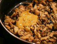 Smelt de boter in een koekenpan. Voeg de knoflook, laat het bruin worden, voeg dan cépes en champignons, basilicum, zout en peper. Bak tot de champignons zacht zijn. Voeg de mosterd en de room en laat inkoken. Roer en haal van het vuur. Wanneer pasta wordt gekookt warm de saus op en voeg de peterselie toe.