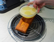 Medzitým zmiešaj šťavu z 4 citrónov spolu so 100 g cukru (posledné 2 suroviny z popisu). Rúru po teraz nahrej na 250°C. Koláč postav na mriežku a pod ňu daj prázdny plech na pečenie na zachytenie prebytočnej glazúry. Potom koláč po celom povrchu polej glazúrou a nechaj postáť asi 30 sekúnd, aby prebytočná glazúra odtiekla. Teraz ho vlož späť do rúry a nechaj v nej 1 minútku zapiecť. Takto bude glazúra nádherne lesklá.