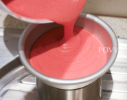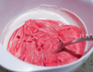 Verwarm zachtjes de rode coulis. Knijp de gelatine uit en los de blaadjes in de microgolf en voeg ze al roerende aan de rode coulis toe. Klop de slagroom halfstijf met poedersuiker. Spatel de rest van de room door het rode vruchtenmengsel tot het een homogeen geheel is geworden. Vet de ronde vorm in met olie. Schep het rode vruchtenmengsel erin. Laat de bavarois in ca. 4 uur opstijven.