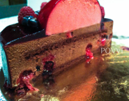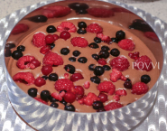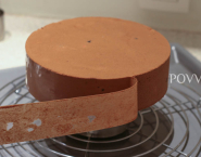 Zet dan de chocolademousse op een taart karton en zet de geglaçeerde bavarois in het midden van de mousse.