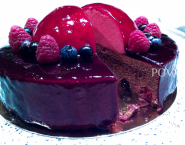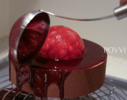 Neem de rodevruchtenbavarois en chocolademousse van de koelkast en zet ze op een rooster. Giet de spiegelglaçage over de bavarois en de mousse en laat lichtjes opstijven.