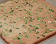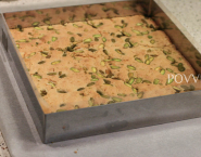 Giet het beslag op een met bakpapier beklede bakplaat en bestrooi met pistaches. Bak het deeg ongeveer 15 minuten op 180°C. Laat afkoelen.