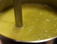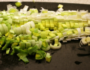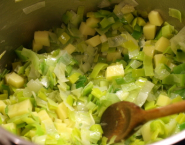 Was de preien, snijd in lengte en snijd in 5 mm dikke plakjes. Verhit de olie in de pot en bak de preistukjes tot zacht. Neem enkele stukjes prei opzij voor ganering. Voeg de geschilde en in kleine blojes gesneden aardappelen en bak nog een beetje. Giet af met water en wanneer soep begint te koken, voeg het bouillonblokje bij.