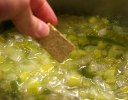 Serveer de soep met de stukjes apart gebracht prei en met gebakken broodjes, baguette, of grissini.