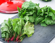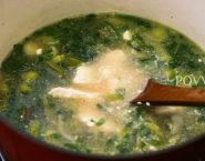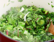 Fruit de preiringen en knoflook in een beetje olie. Doe als alles glazig is het gewassen en gesneden radijsblad en rode bietblad erbij en laat dit 3 minuten meebakken. Schenk een scheutje bouillon erbij als het mengsel te droog is. Voeg de bouillon toe, breng aan het koken en laat de soep 5 minuten zachtjes pruttelen.