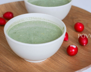 Schenk de soep in mooie soepkommen en strooi eventueel er flinterdunne staafjes radijs of croutons over.
