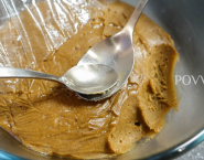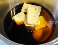Giet in een middelgrote pan de gefilterde koffie en het water. Voeg de boter, suiker en honing toe aan de opgeloste koffie in de pan. Breng het mengsel op middelhoog vuur aan de kook en kook, roer, net totdat de boter smelt en de suiker oplost en het mengsel homogeen is. Haal het vuur eraf en giet het in een grote kom. en koel gedurende ongeveer 10-15 minuten.