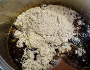 Voeg de bloem toe en meng met een grote houten lepel tot alle bloem is opgenomen.